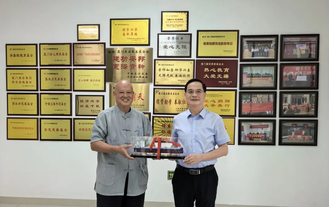 24日下午,集美大學(xué)黨委書(shū)記邱偉杰、校辦主任黃海宏、校董辦主任呂嫻一行蒞臨廈門(mén)建安慈善基金會(huì ),拜訪(fǎng)校董孫吉龍先生。孫吉龍先生對邱書(shū)記一行的到來(lái)表示熱烈歡迎。